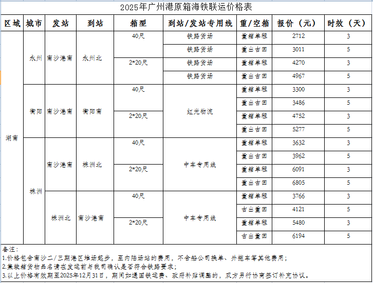 4、广州南沙港南站至湖南省各站点海铁联运价格表