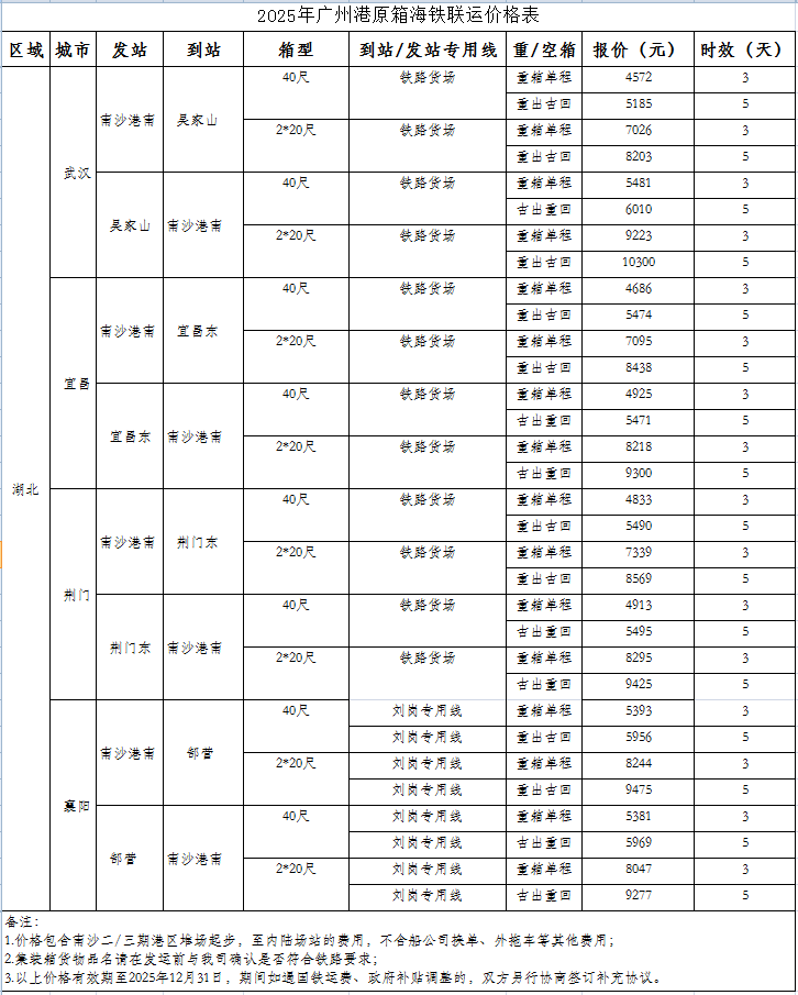4、广州南沙港南站至湖北省各站点海铁联运价格表